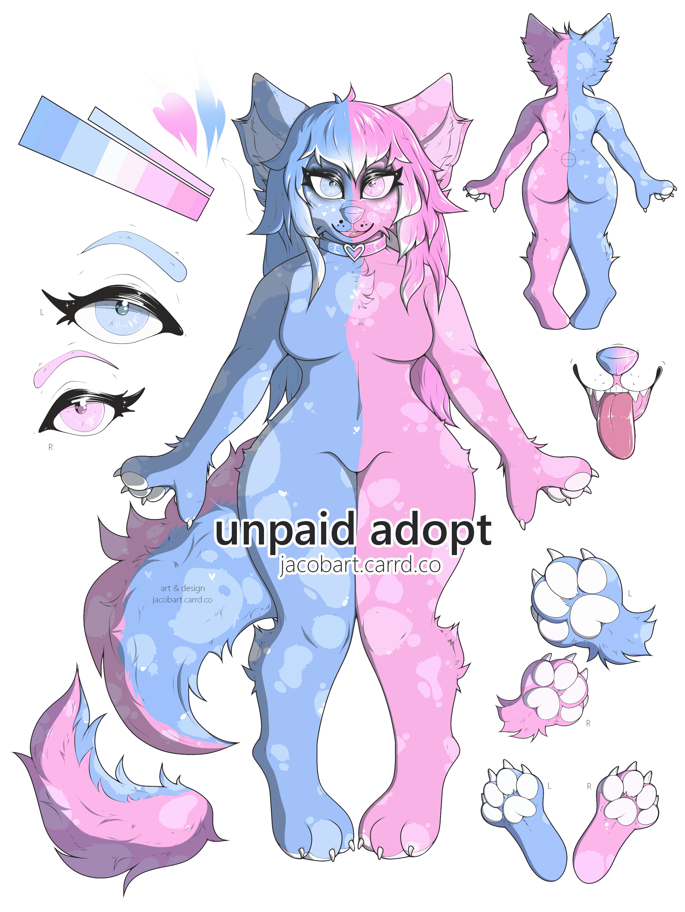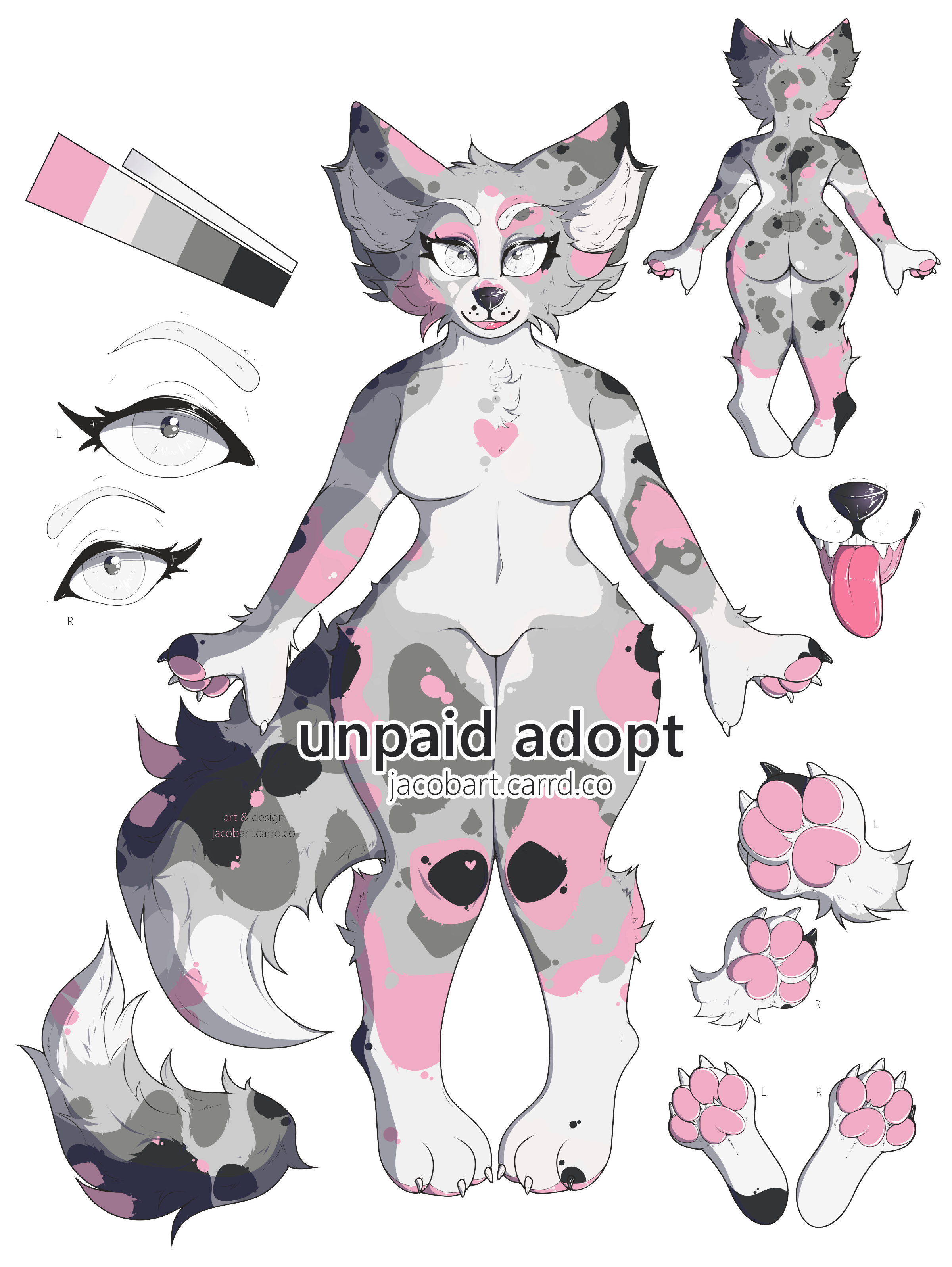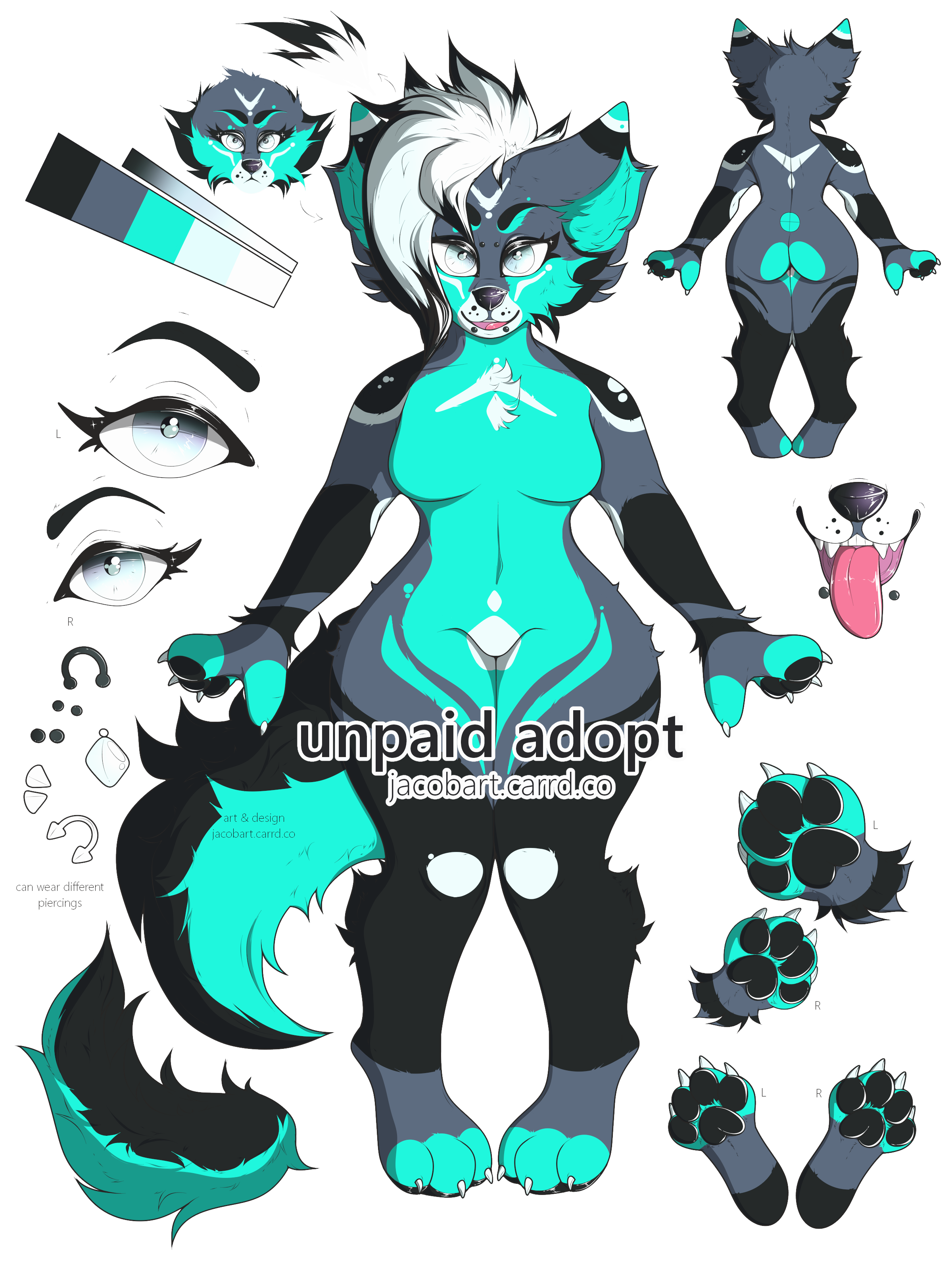 Adoptables are pre-made designs that can be bought and used as a character, fursona, etc, however you'd like!My adopts come as is, so what you see is what you buy. No changes to existing designs will be accepted.This base is made by me, comes with shading, and a full front and back view, with details of paws, eyes, items, etc. Only available as female/femme body type for now. See example below of the base.If you buy an adopt, you'll get the image shown without watermarks, a flat colour version, a standalone frontal fullbody version, any alternative versions if applicable, and the full rights and ownership of the design.Before adopting, please also read the adoptables terms of service below!