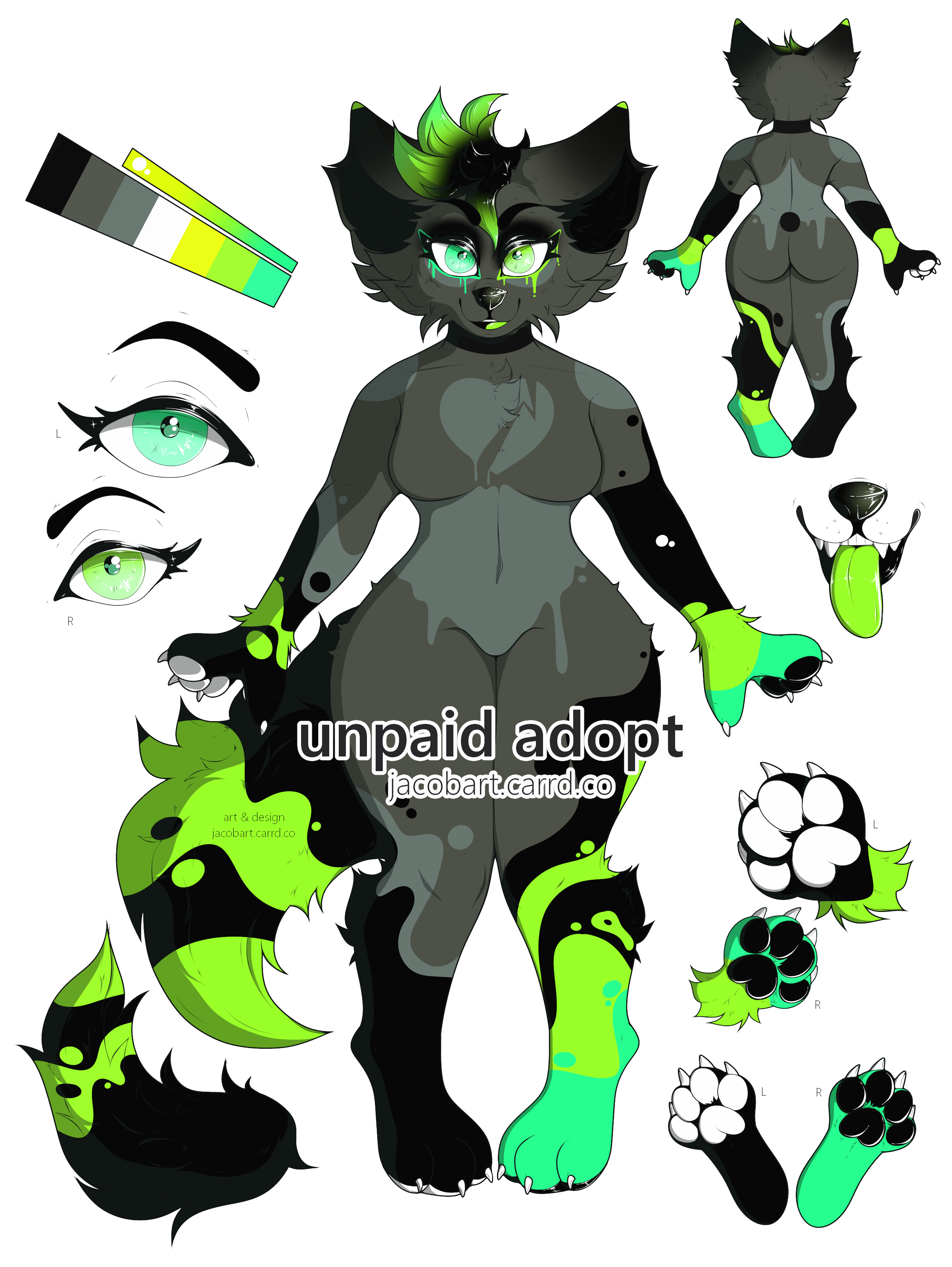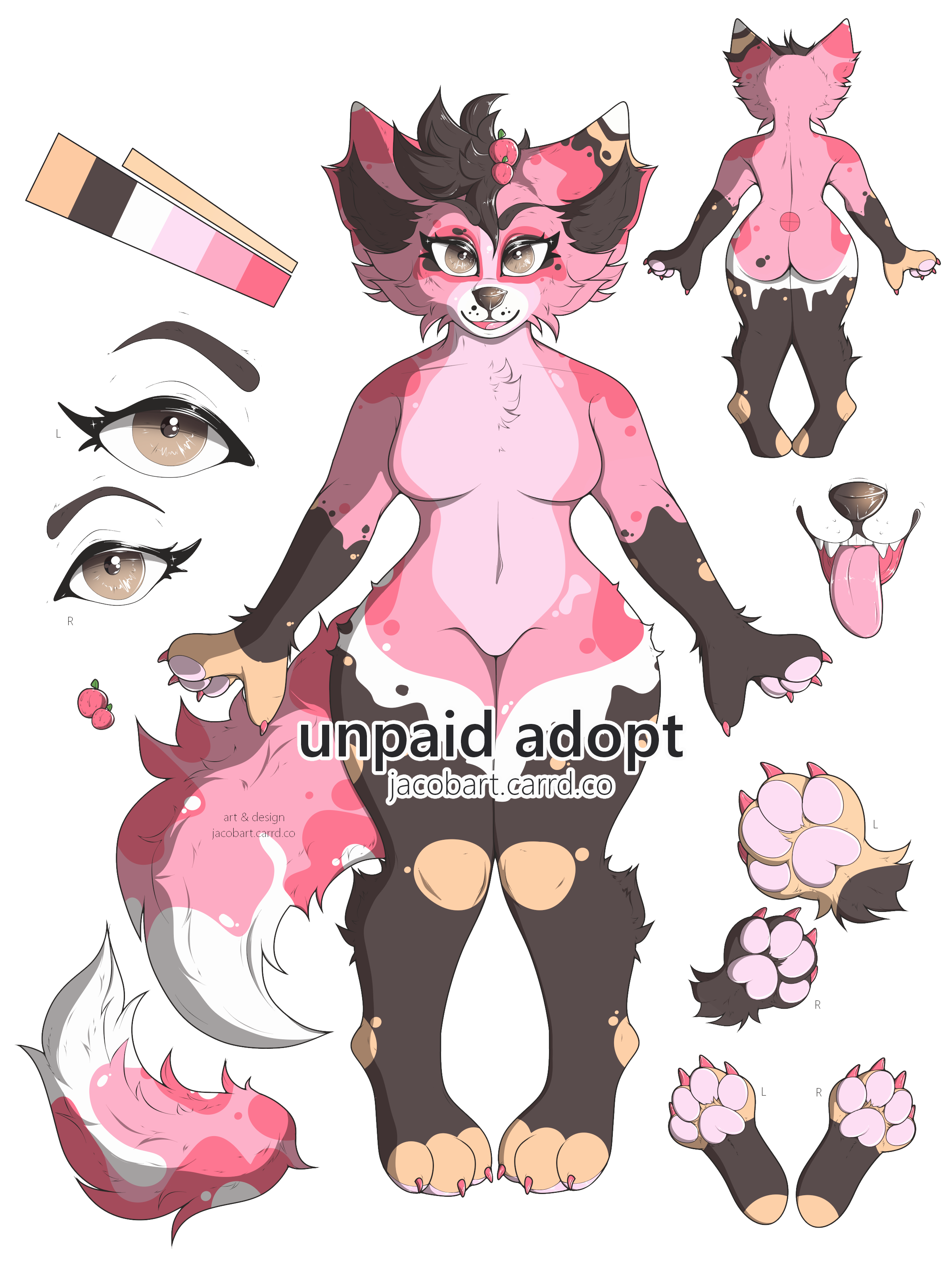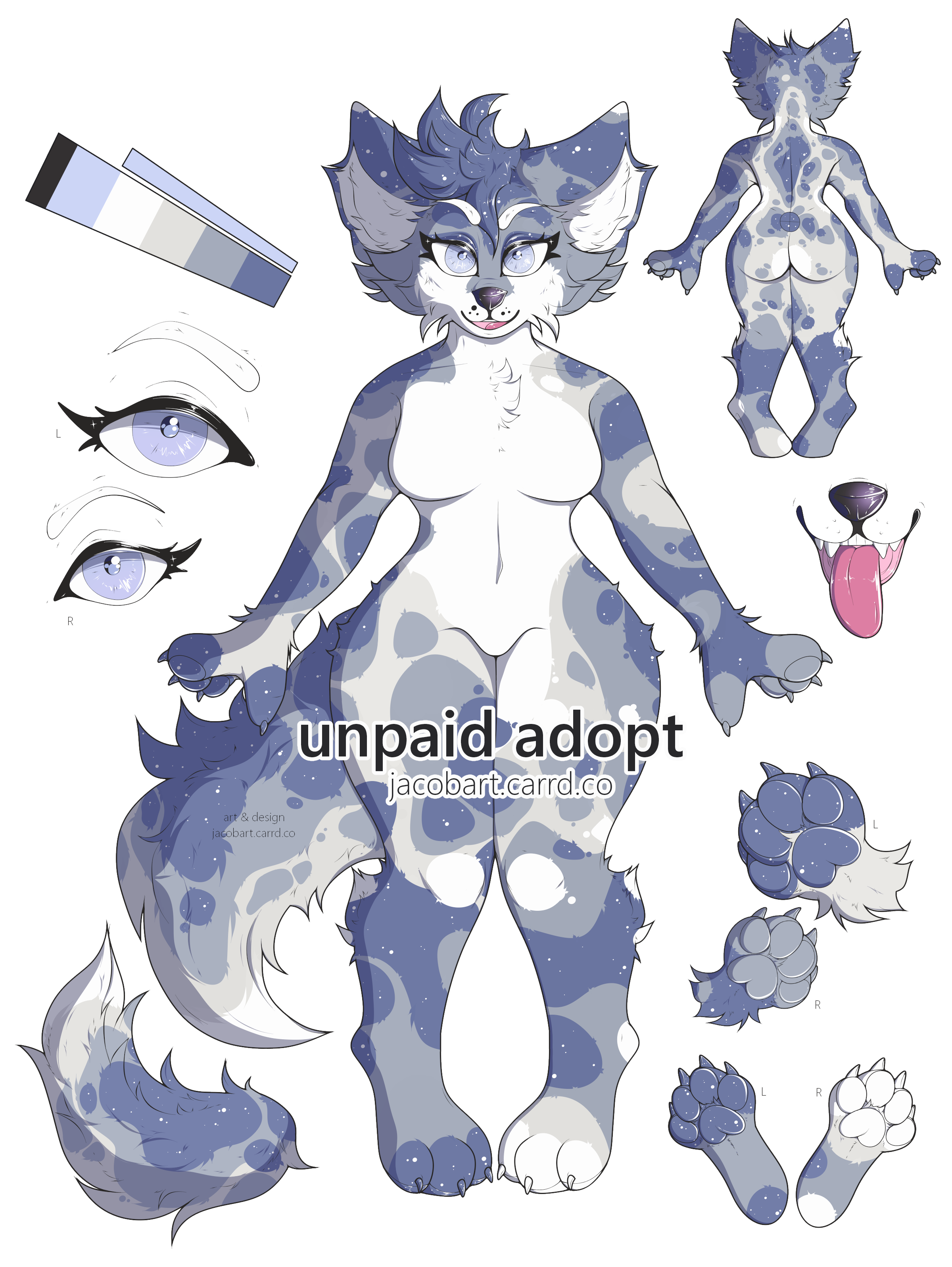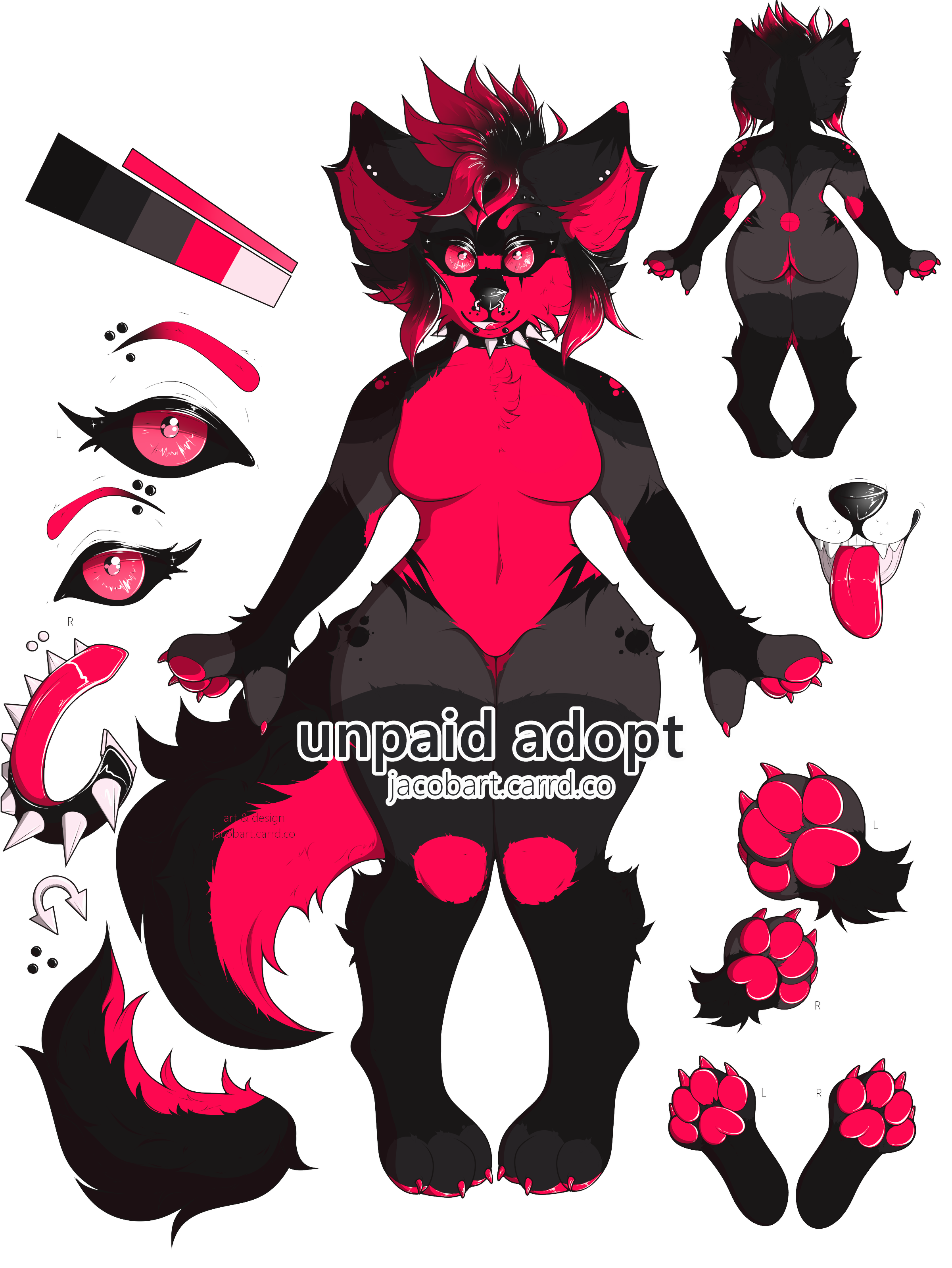 Adoptables are pre-made designs that can be bought and used as a character, fursona, etc, however you'd like!My adopts come as is, so what you see is what you buy. No changes to existing designs will be accepted.This base is made by me, comes with shading, and a full front and back view, with details of paws, eyes, items, etc. Only available as female/femme body type for now. See example below of the base.If you buy an adopt, you'll get the image shown without watermarks, a flat colour version, a standalone frontal fullbody version, any alternative versions if applicable, and the full rights and ownership of the design.Before adopting, please also read the adoptables terms of service below!